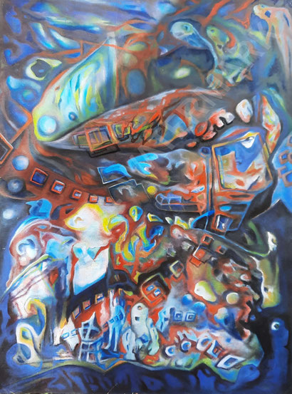In seiner Farbwahl verbindet Motzel kühle Blau- und warme Orangetöne so, dass sie Spannung und Tiefe erzeugen, die einen Sog entfalten. Es könnte eine Traumwelt sein, eine unterbewusste Landkarte oder ein Fragment des inneren Kosmos – für jeden Betrachter ein persönliches Voilà.