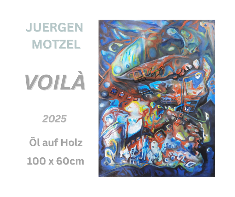„Voilà“ – ein Ausruf, der fast eine theatralische Geste ist, und genau so wirkt auch das Werk von Juergen Motzel. Die Tonsprache des Öls auf Holz verschmilzt mit einem Fluss lebendiger Farben und architektonischer Strukturen, die sich zwischen organisch und geometrisch bewegen. Auf den ersten Blick entfaltet sich eine surreale Landschaft voller Bewegung und rätselhafter Figuren, die augenzwinkernd ein universelles: Seht her, hier ist etwas Großes, Andersartiges – Voilà! verkündet.